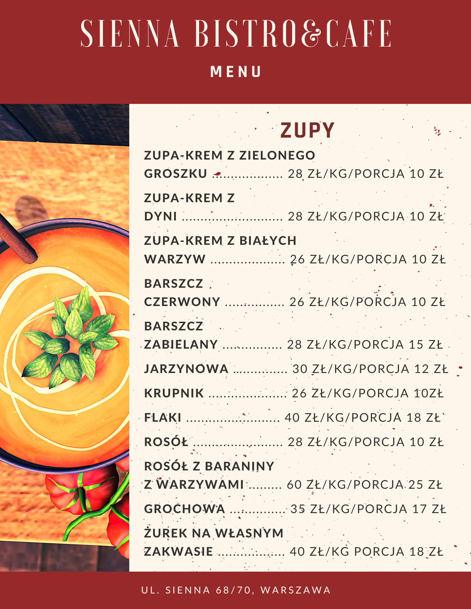 Nasza polska kuchnia zachwyca szczególnie autentycznymi potrawami. Jesteśmy znani z naszych sałatek. Musisz spróbować naszych wyjątkowo smacznych ryb i makaronów a także naszej aromatycznej kawy albo gorącej herbaty. Przyjdź do naszej restauracji na śniadanie, obiad albo kolację!