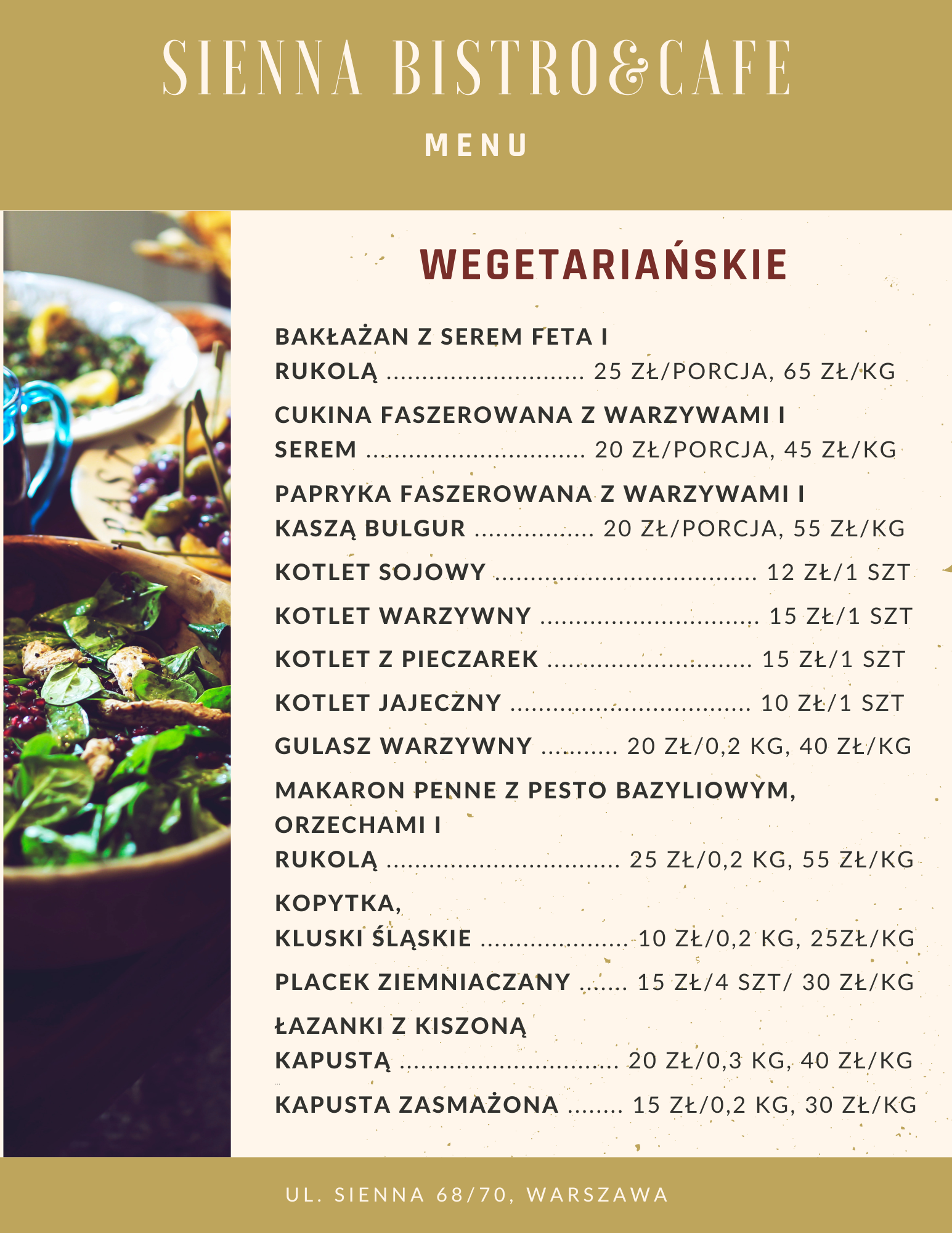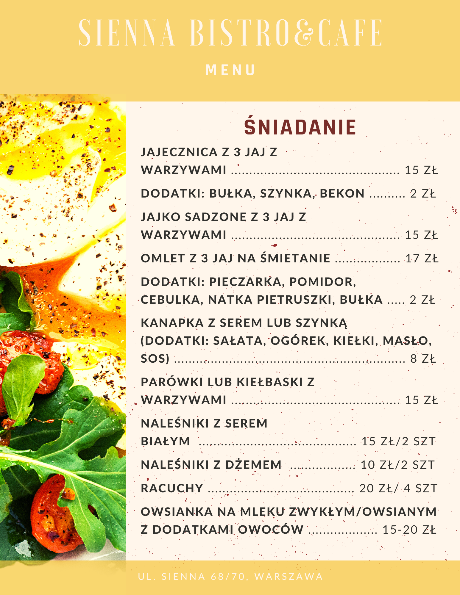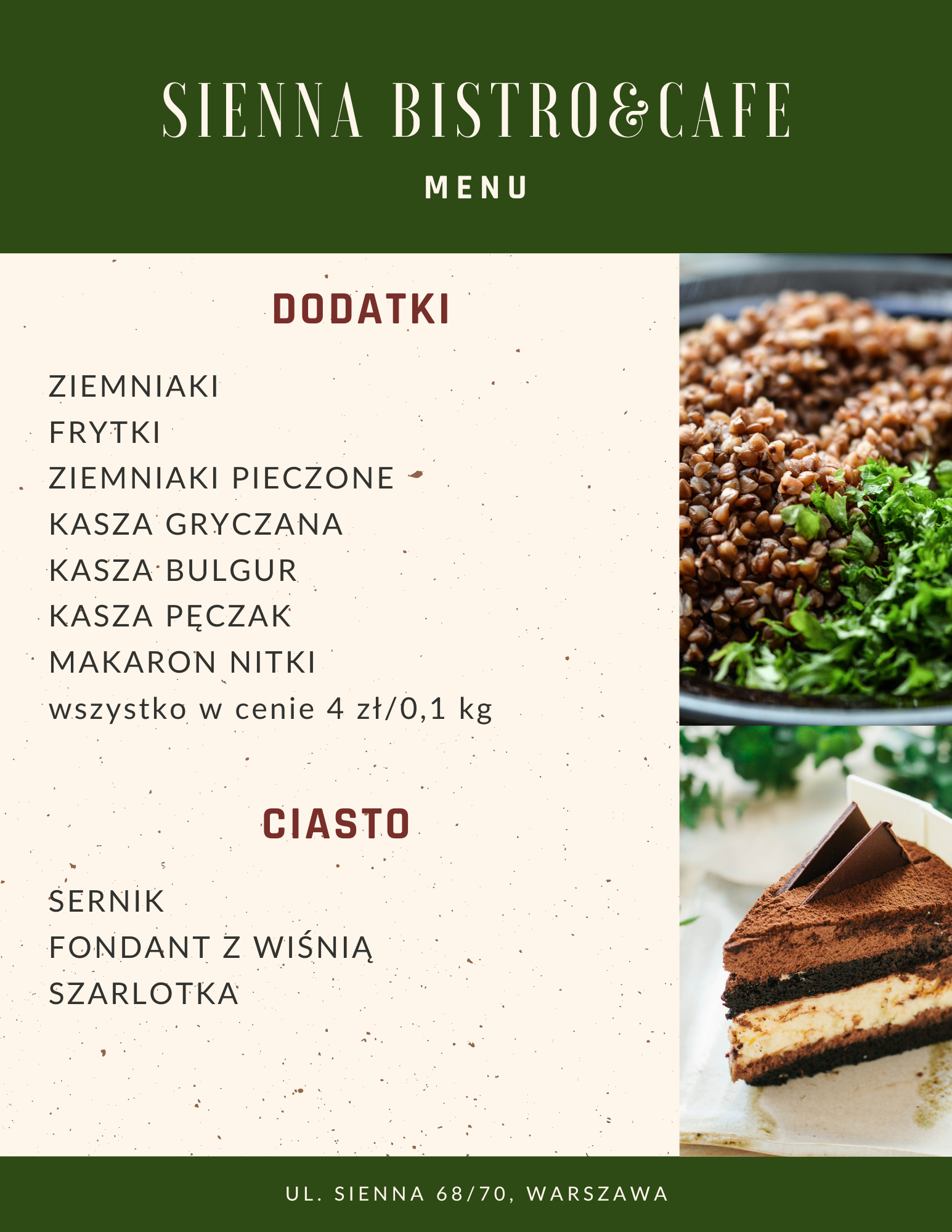 Czy to w przerwie obiadowej, czy na pyszną przekąskę z przyjaciółmi lub kolegami po pracy – nasz lokal jest odpowiedni na każdą porę dnia. Bistro Sienna & Cafe oferuje w przystępnej cenie dokładnie to, czego potrzebujesz. Spróbuj naszych różnorodnych i pysznych potraw, jak też pasujących do nich napojów.